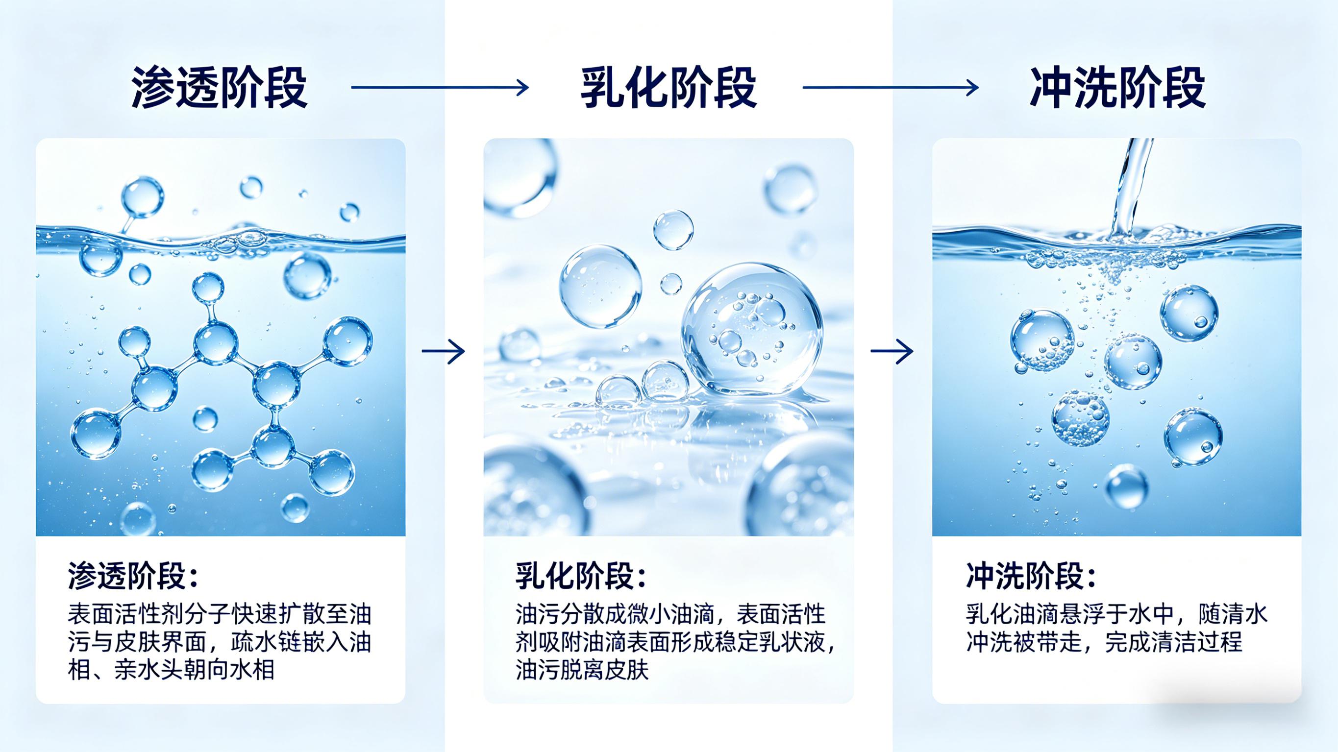 不含磨砂颗粒型则采用多种表面活性剂复配技术。表面活性剂分子一头亲油、一头亲水:亲油端牢牢“抱住”油污并将其包裹成微小颗粒,亲水端则随水流将其冲走。该路线不含磨砂颗粒,不会对皮肤角质层产生物理摩擦,同时对下水管道无颗粒沉积,单次使用量通常较低,适合日常高频使用场景。