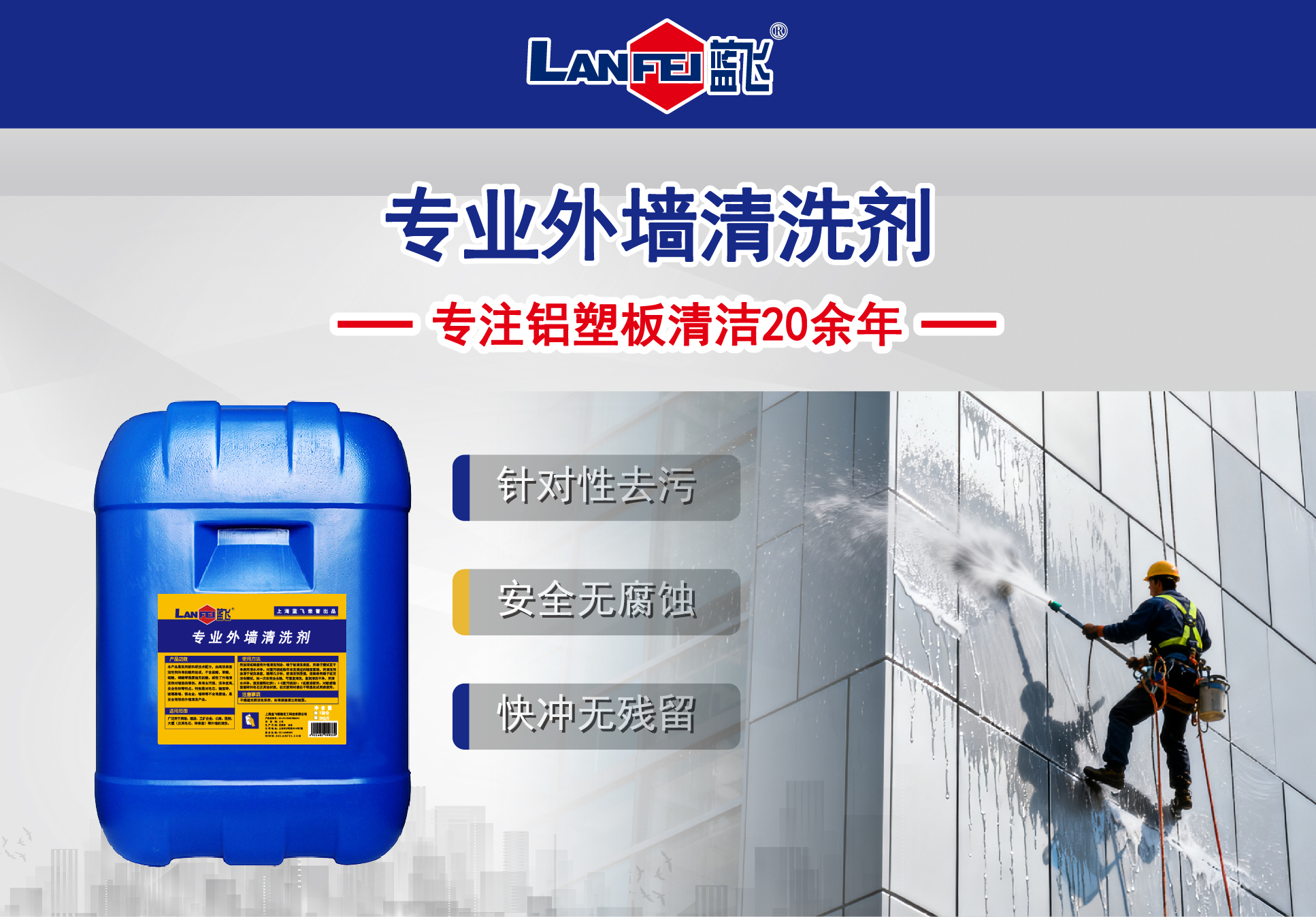 专业外墙清洗剂(铝塑板清洗剂)是上海蓝飞公司推出的一款以高效、安全无腐蚀为宗旨的楼
